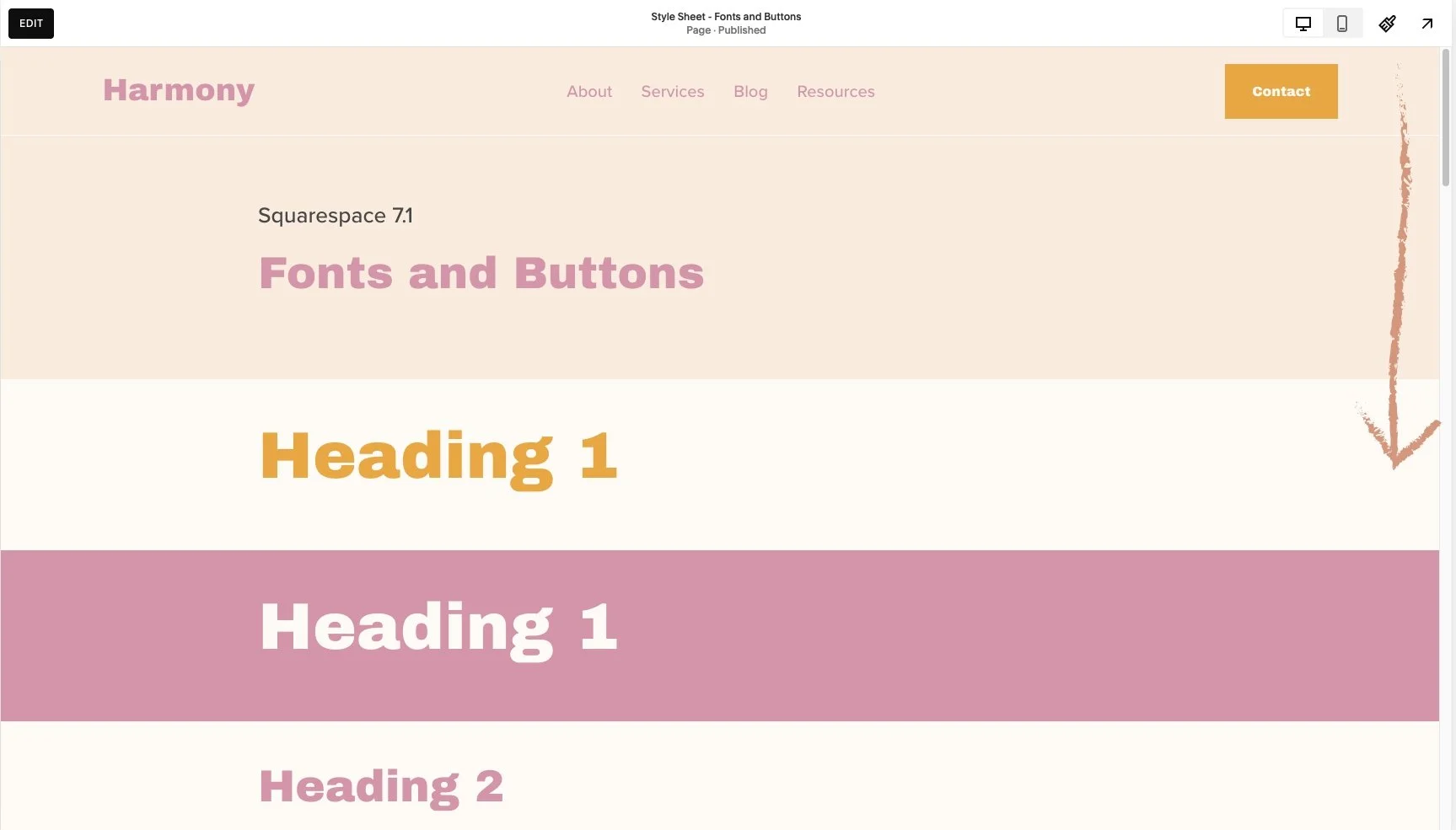 🔸 You have all of these sections lined out for each one of the Harmony Template’s Color Themes on a Page named “Style Sheet - Fonts and Buttons” located on the Not Linked section. You can use it and easily see what the content of your site will look like when you make changes on the Colors menu.