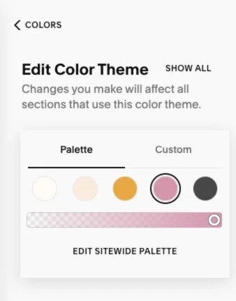 • You will notice something very different about the page you are on, Squarespace is going to tell what Color Theme has been assigned to each section on the specific page.