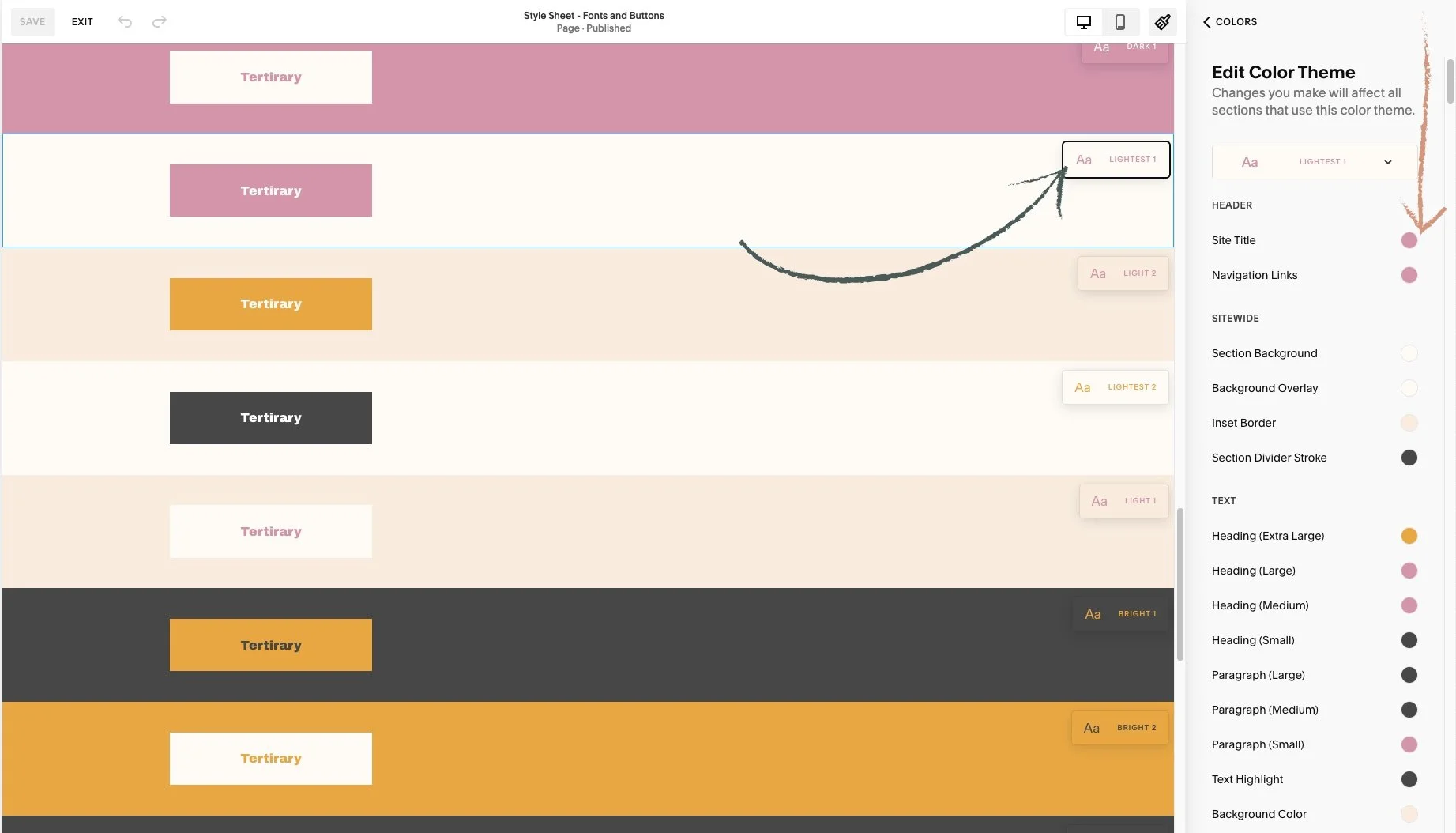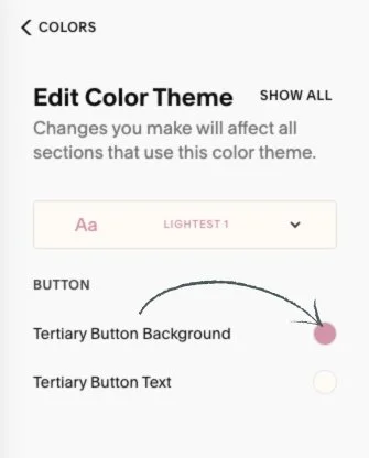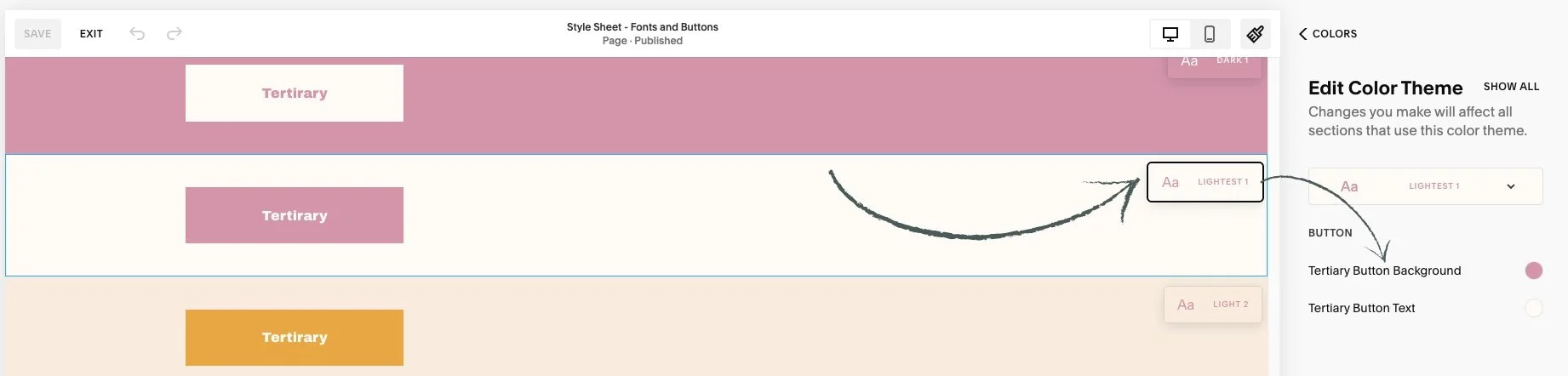 ⭐️ Keep in mind that the settings you choose in Site Styles for each color theme will apply wherever that theme is used. So, every time you add a Tertiary Button within the Lightest 1 theme, it will always appear with the assigned styling.
