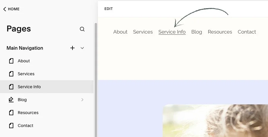 On your Main Menu on the top left-hand side, click on Website, then Pages and you'll see each of the pages of your site there.