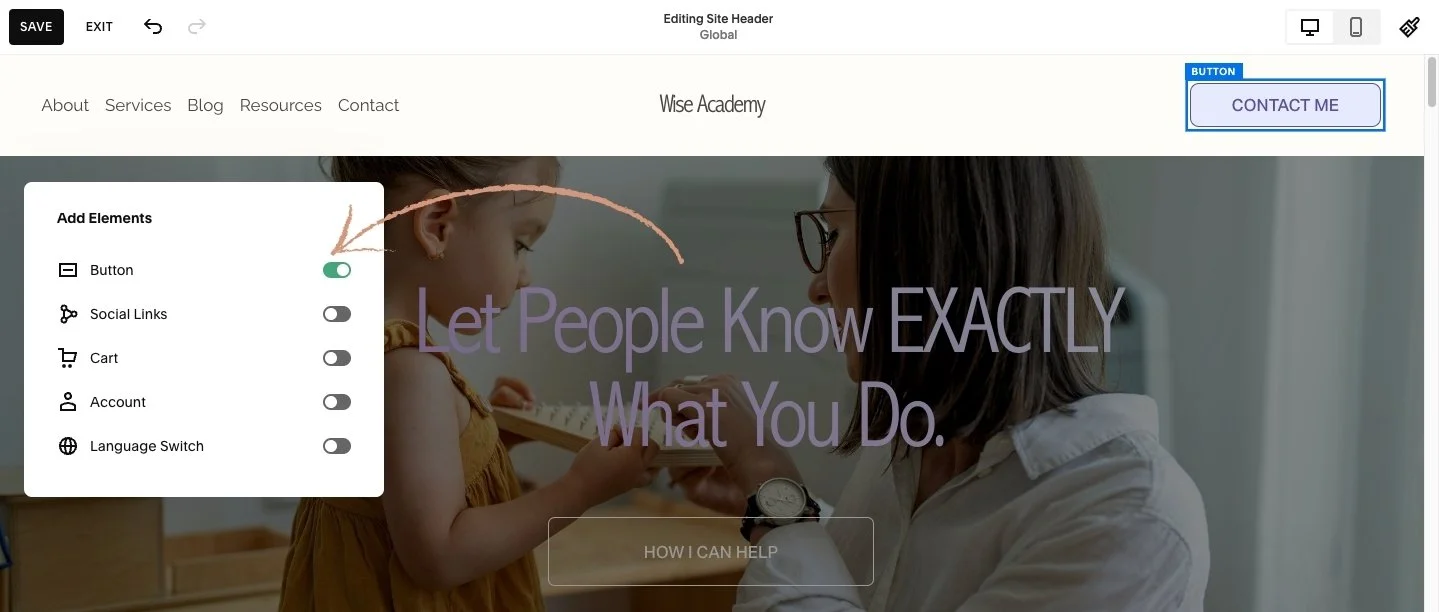 💡 It's important to keep in mind that toggling on any of these elements will make them display in both the Desktop View menu as well as your Mobile View; so it's not only independent to mobile or desktop, it'll appear on both.