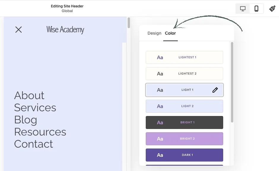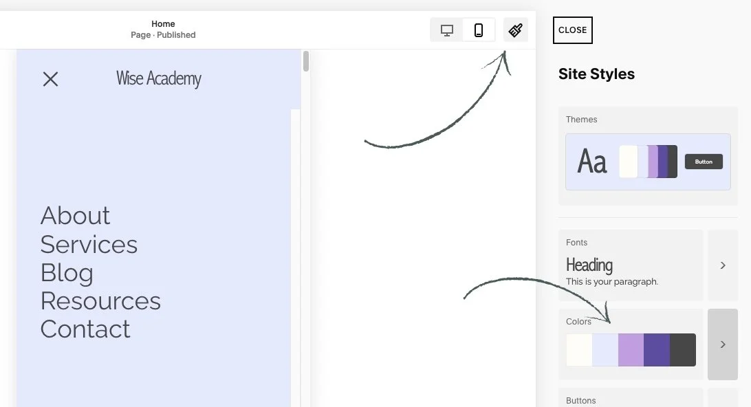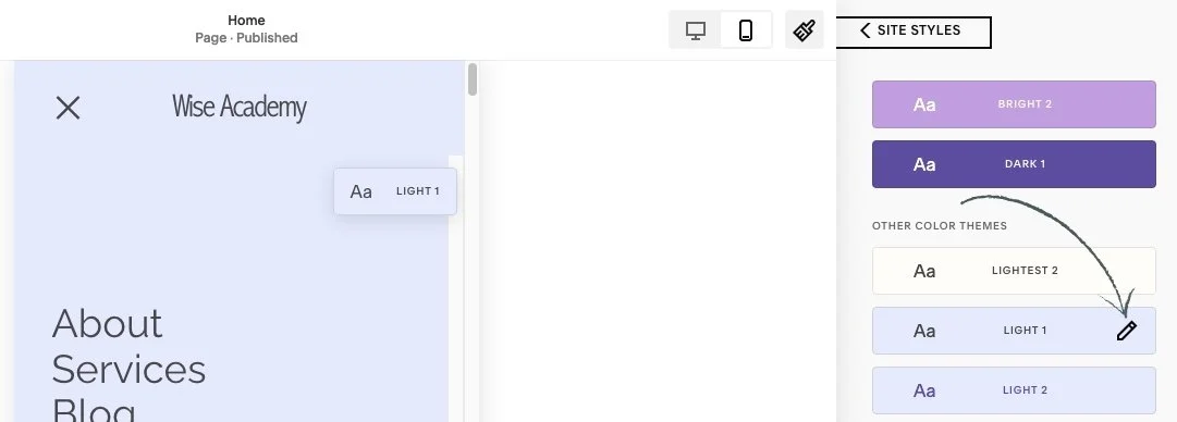 🖌️ As a reminder: to edit these Themes you can just head into your Site Styles which is the Paint brush icon in the very top right of your screen and then click into Colors.