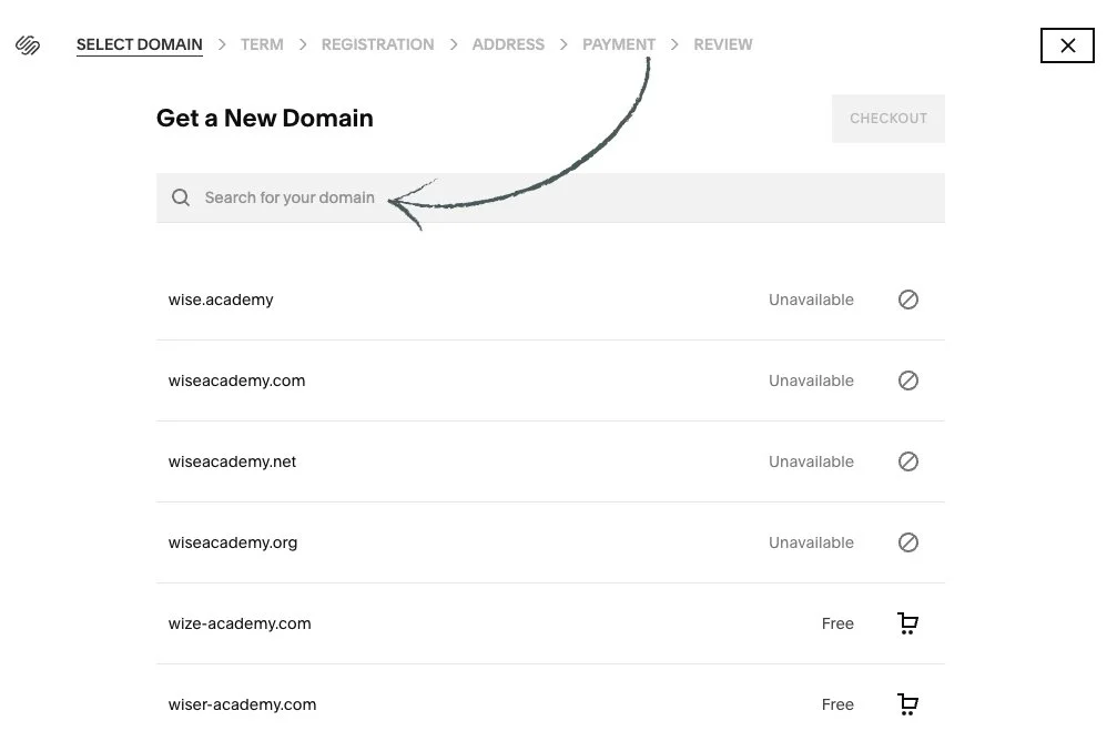 5. Once you’re there you can search any domain name you would like in the search bar, and Squarespace will let you know if it’s available or not. Squarespace will also give you some alternative options.
