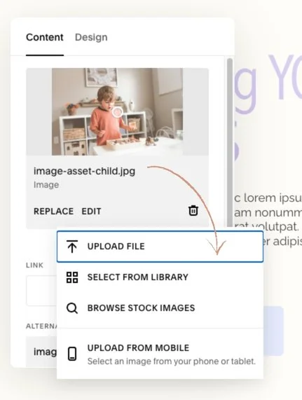 Click replace and then you can upload an image, select one from your library, or browse stock images available through Squarespace.